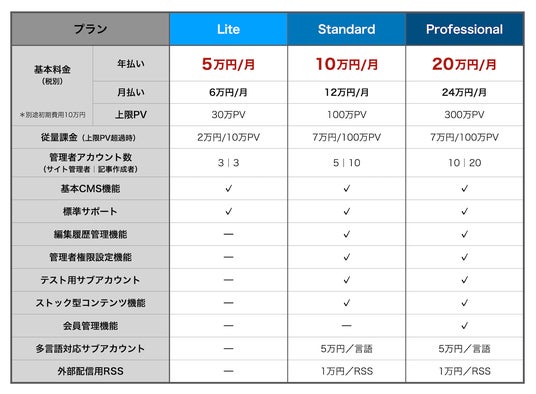 - Lite:小規模なコーポレートサイトや、まずは導入を試したい企業に最適