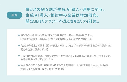 サマリー:情シスの約6割が生成AI導入・運用に関与、生成AI導入・検討中の企業は増加傾向。懸念点はリテラシー不足とセキュリティ対策。