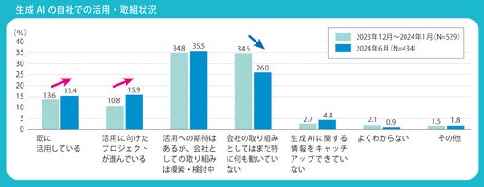 「生成AIの自社での活用・取組状況」について、2023年12月~2024年1月と2024年6月の調査結果をもとに、約半年でどのように変化しているのか推移を見てみます。