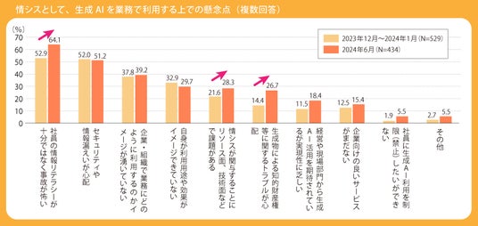2023年12月~2024年1月と、今回の2024年6月の結果の推移を見ると、前回調査で第1位だった「社員の情報リテラシーが十分ではなく事故が怖い」が、52.9%から今回は64.1%へと大きく伸びています。また、そのほかの懸念点として大きく伸びたのが、「生成物による知的財産権等に関するトラブルが心配」で14.4%から26.7%に上昇しています。生成AIの活用が広まり、その知識が普及したことで具体的なリスクがより明確に見えてきたと考えられます。