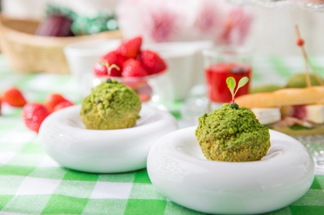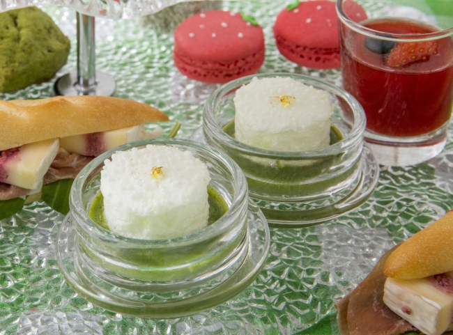 ・苺のマカロン ・抹茶のスコーン ・抹茶ムース ・口どけメレンゲ、抹茶のスープ ・抹茶の苔玉 ・抹茶のラミントン ・苺ブリーチーズと生ハムのサンドイッチ ・苺ジャム ・苺のクロテッドクリーム ・抹茶とホワイトチョコのディップ