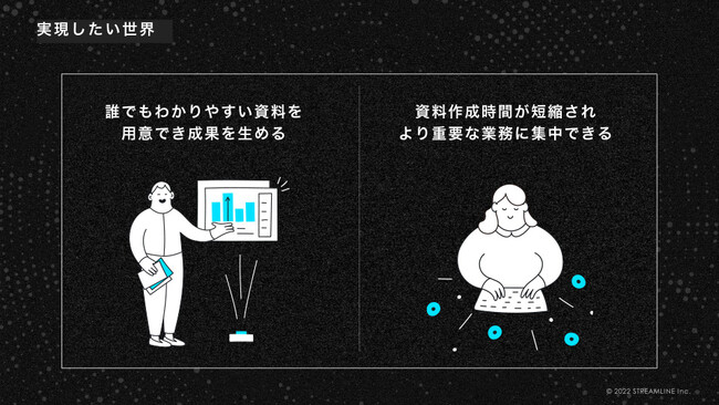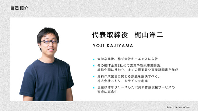 株式会社ストリームラインは、「コミュニケーションの合理化で、ビジネスを進化させる」という理念のもと、2016年にビジネス資料作成代行サービス「バーチャルプランナー」を提供開始。創業6年で700社以上、1,500部以上の資料作成実績を有し、成果を生む資料を短時間で用意し、コミュニケーションを最小の労力で成立させる支援を行ってきました。2021年6月には、資料作成ナレッジと経営企画・IR実務経験者の知見を掛け合わせ、IR資料に特化した作成支援サービス「LEAD」をリリース。企業と投資家間のさらなる理解促進・コミュニケーションの質の向上を目指し、IR資料の改善をストーリー構成からデザインまで一貫してサポートする総合的なサービスを提供しています。