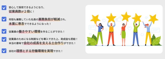 「助成金コーディネート」は、助成金を受給するだけでなく、助成金受給に向けたプロセスでしっかりと労務整備を行うことで、従業員が働きやすい理想的な労働環境を実現する点が特徴です。その結果として、採用力の向上や社員の定着、理想的な労働環境の実現などの効果を実感していただいています。リニューアル後のサービスサイトでは、導入効果や導入事例についても詳しく紹介しています。