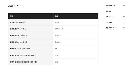 今まで商品シリーズページで各サイズ・色展開などをご紹介していましたが、新公式サイトでは品番別の商品詳細ページを新設しました。これまで紙カタログでしか確認できなかった品質チャートなどの情報を新たに追加。商品ごとの情報も一覧にまとめ、一目で確認しやすくなっています。