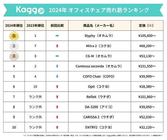(※)ランキング表記載の定価は、2024年11月時点のメーカー提示価格(税込)です。チェアの仕様によって価格は変動します。Kagg.jp会員にご登録いただくと、割引価格でお求めいただけます。(一部商品を除く)