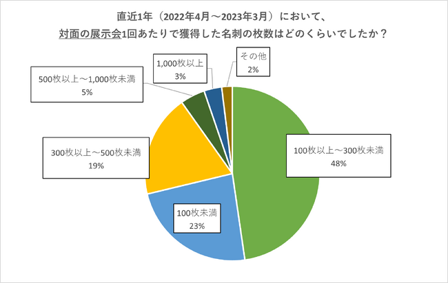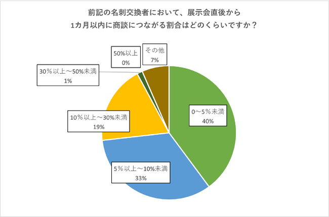 一方で、対面のリアル展示会1回あたりで獲得した名刺枚数は「100~300枚未満」が最も多く48%でした。その後1ヵ月以内に商談に繋がる割合も、「0~5%」という回答が最も多くはありますが、「5~10%未満」が33%、「10~30%未満」も19%となりました。名刺と顧客情報という違いはあるものの、オンラインと比較してリアル展示会の方が、顧客情報の獲得、そして商談に繋がる割合が高いといえそうです。