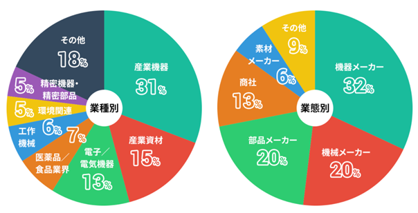 機械、機器、部品メーカを中心に、産業機器や電気/電子、医薬品、食料品までの幅広い製造業のBtoB企業様にご利用いただいております。