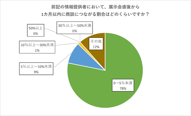 オンライン展示会「1回あたりで獲得した顧客情報数」は「100件未満」が最も多く、72%となりました。また、情報提供者の内、1ヵ月以内に商談に繋がる割合は「0~5%」が最も多く78%と、新規リード獲得に苦戦している様子です。