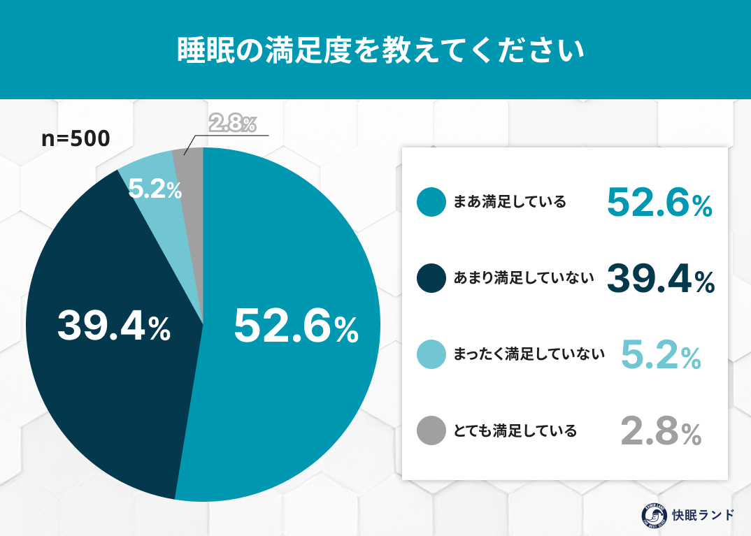 - 睡眠満足度は「まあ満足している」が52.6%、一方で約4割が「満足していない」と回答