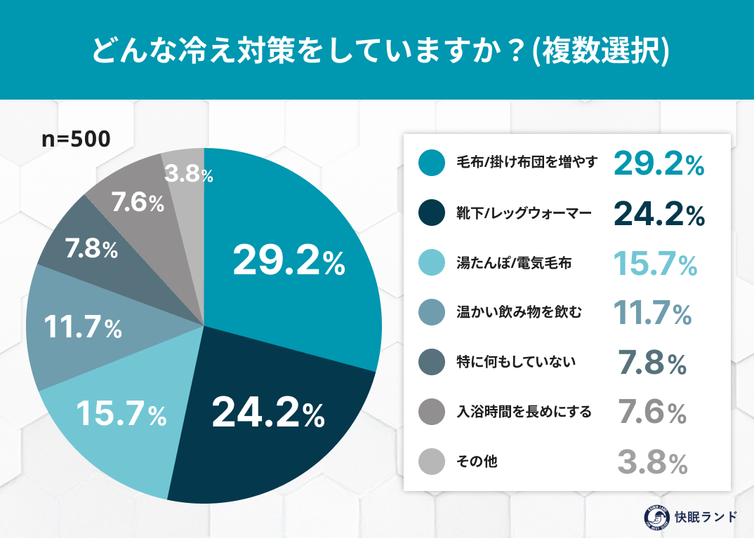 - 冷え対策のトップは「毛布・掛け布団を増やす」(29.2%)、次いで「靴下・レッグウォーマー」(24.2%)