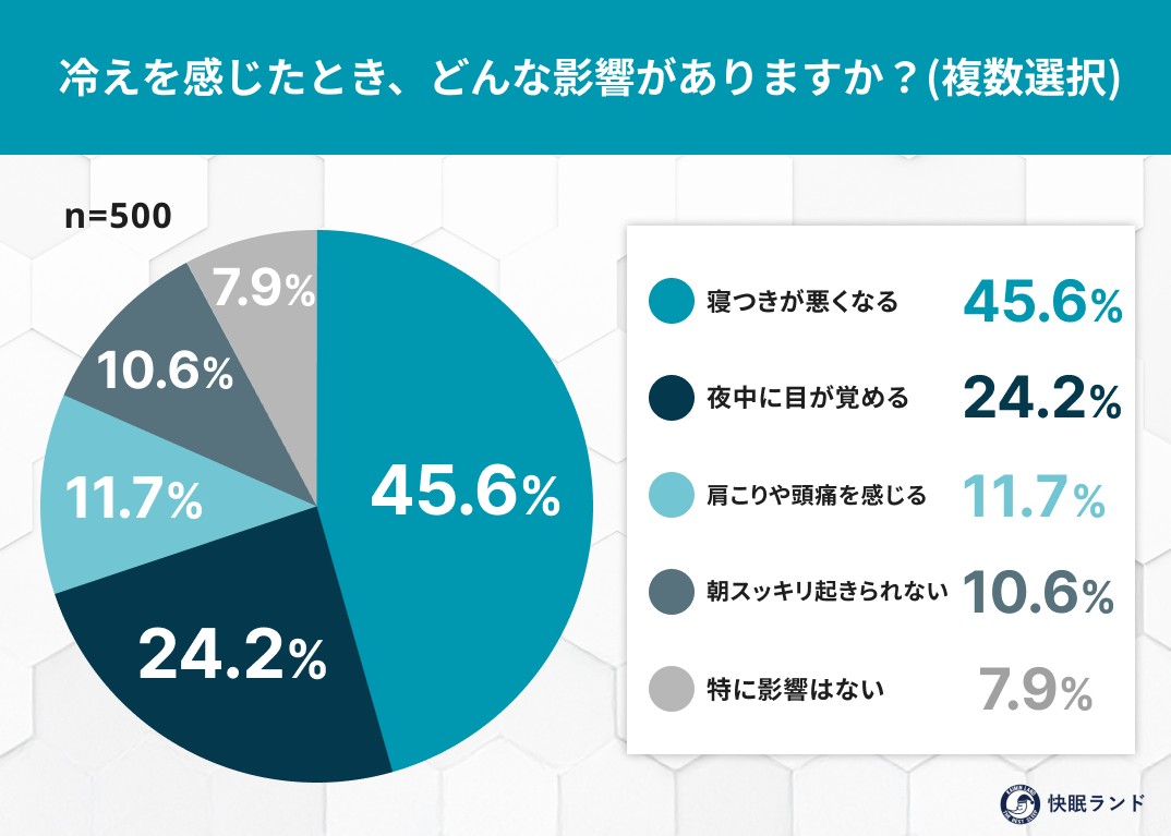 - 冷えによる影響は「寝つきが悪くなる」(45.6%)が最多