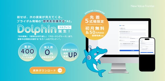 ブライダル業界向けDXを推進する株式会社ニューバリューフロンティア(本社:東京都渋谷区、代表取締役:高宮孝一郎)は、ウェディングプランナーの思考をサポートするAIシステム「Dolphin(ドルフィン)」の導入成果を発表いたします。