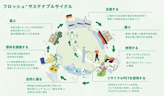 自然と、心地よく暮らしつづけるために。製造から使用後までトータルで考えるフロッシュ(R)。自然と使う人へのやさしい工夫がたくさんつまっています。