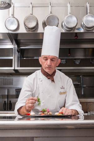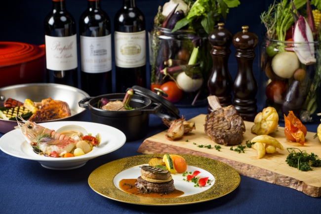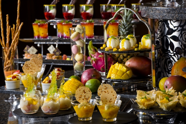 フランス人シェフこだわりの選べるメインディッシュは9種類をご用意。オマール海老や近海魚などを使った美しい前菜と、ラズベリームースやフルーツロールケーキなどの豊富なデザートは、ビュッフェ台からお楽しみいただけます。旬のマンゴーを使ったスイーツ5種類はパティシエがオーダーごとに目の前で仕上げるスタイルでお届けいたします。