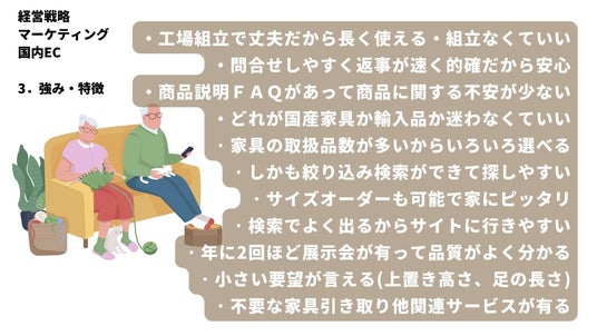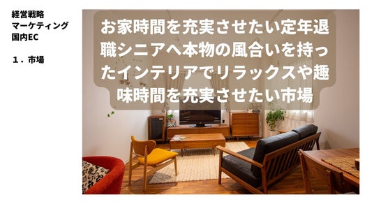 定年退職者をターゲットにした「家時間」を充実させるインテリア市場の拡大に向けた具体的な施策を発表しす。商品の強みや特徴として、耐久性のある工場組立て済みの家具や、豊富なFAQの提供など、安心して購入できる仕組みの強化を図ります。