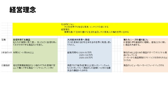 株式会社大川家具ドットコムは、地域に根ざしたビジネスを基盤に、新たな市場での成長を目指す姿勢を強調します。今後10年間のビジョンと目標を共有し、さらなる挑戦と成功を目指します。