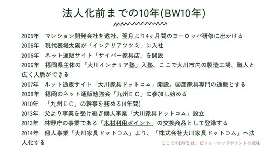 経営理念は10年前とほとんど変更なしです。家具の街「福岡県大川市」の家具産業を世界に通じるようにしたい。そのために3つの柱を立てました。