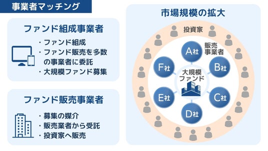 同様に自社で投資家を抱えていない事業者も、ファンド組成という役割でクラウドファンディング市場に参入いただくことが可能となります。逆に投資家はいるけれどファンド組成に課題を抱えている事業者も、ファンド販売事業者という役割で、クラウドファンディング市場において継続的に活動することが可能となります。