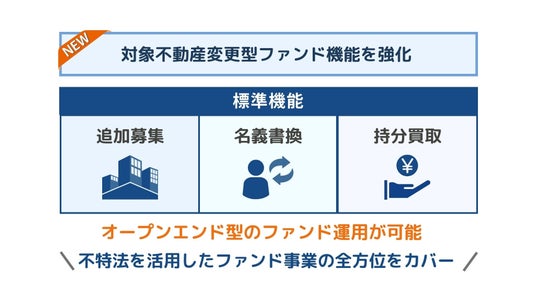 対象不動産変更型はファンドの運用中に投資対象の物件の出し入れを行うことになりますので、CSMでは物件を追加する度に「追加募集」を行うことが可能です。また、長期運用を実現するための機能として、「名義書換」、「持分買取」機能を標準で備えております。