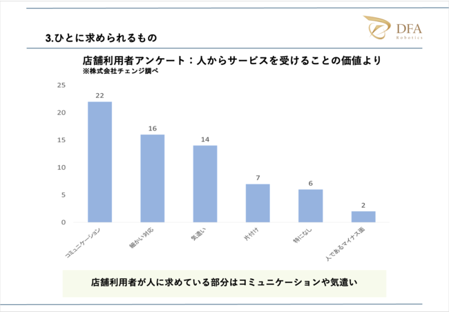ロボットが配膳を行い、機械で会計をするロボットサービスを導入した際、お客様が飲食店で人に求めるサービスとはどこにあるのでしょうか。ファミリーレストランに訪れたお客様に行ったアンケートによると「人から何の価値を受け取りたいか」という問いに対して、「コミュニケーション」や「細かい対応」という結果が得られました。