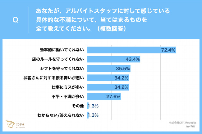 具体的な理由として、「効率的に動いてくれない」72.4%、「店のルールを守ってくれない」43.4%などの意見が多く、アルバイトスタッフに対する悩みがあることも分かりました。
