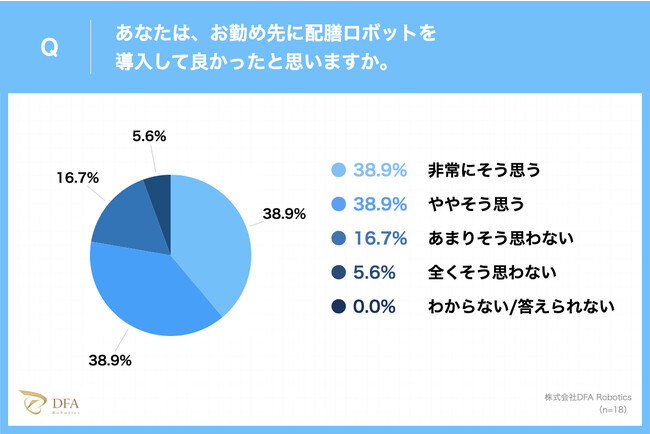 当社が行った飲食店店長に向けたアンケート調査において、「勤務先の飲食店で配膳ロボット導入しているか?」という質問に対し、「導入している飲食店」は17.1%の2割弱とまだ少ないながらも、「導入して良かったと思いますか?」の質問に対し、約8割が「導入して良かった」(「非常にそう思う」38.9%、「ややそう思う」と回答しています。