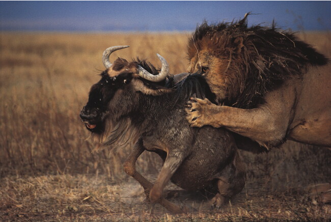 アフリカの夜明けのサバンナで、ライオンがヌーの息の根を止める様子を捉えた一枚はさすがの迫力。実はこのヌー、その直前にハイエナたちが倒した獲物をライオンが横取りしたものでした。岩合さんによれば、“百獣の王”と呼ばれるライオンは狩りが下手。草食動物の逆襲で命を落とすこともあるのだとか。その他、水辺にいるヌーの大群に飛びかかるワニを収めた作品や、長野県・地獄谷で撮影した雪玉で遊ぶスノーモンキーの写真が登場。動物写真を撮る際は、長い時間ダイレクトに目を合わせると相手は“敵”だと認識するため(猫も同じ)、目はずっと見ないものだと教えてくれました