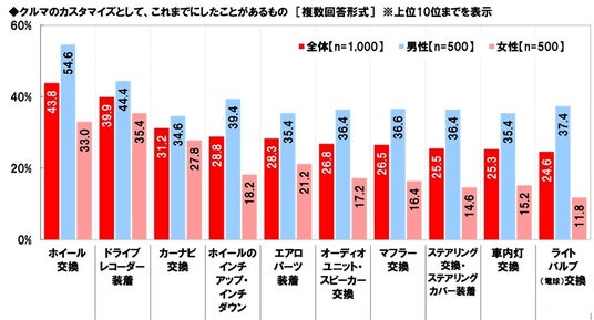 男女別にみると、男性では「ホイール交換」が18.0%、「ホイールのインチアップ・インチダウン」が14.6%、「オーディオユニット・スピーカー交換」が12.8%、「マフラー交換」が11.2%と、女性(順に11.6%、7.2%、7.4%、4.0%)と比べて5ポイント以上高くなりました。