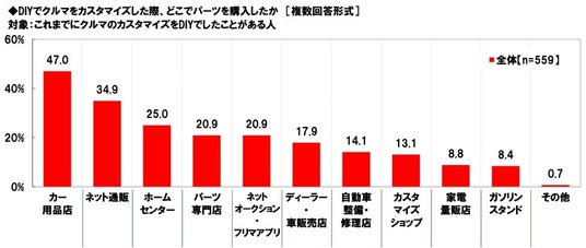- DIYでクルマをカスタマイズしたときのパーツの購入場所 1位「カー用品店」 2位「ネット通販」