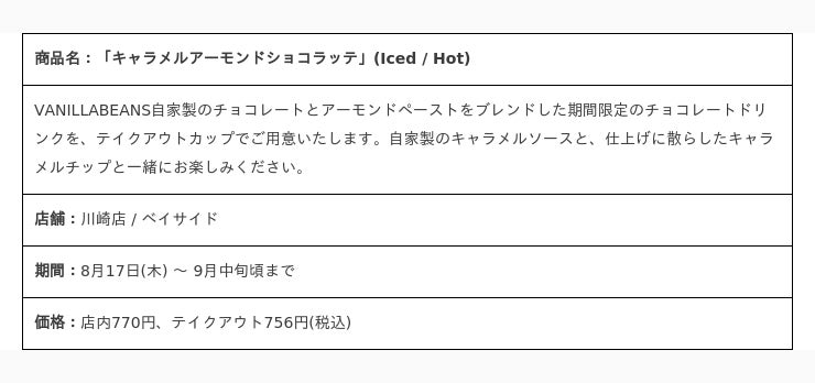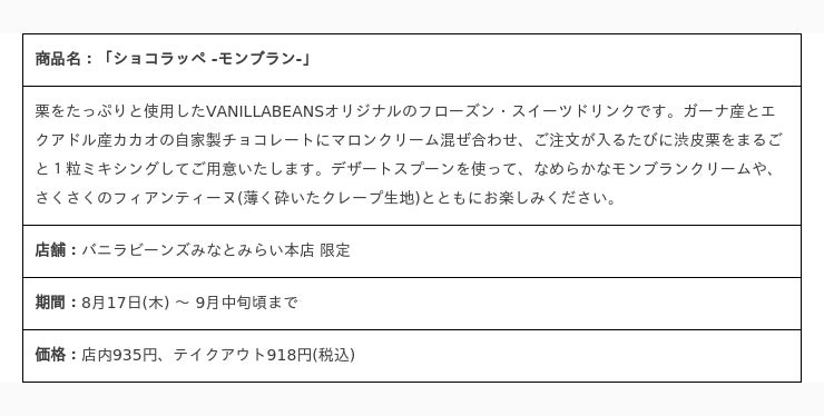 チョコレートデザイン株式会社(代表取締役:八木克尚、本社所在地:横浜市)が運営するブランドVANILLABEANS(バニラビーンズ)は、実店舗カフェにて期間限定のスイーツドリンク各種を8月17日(木)から販売いたします。