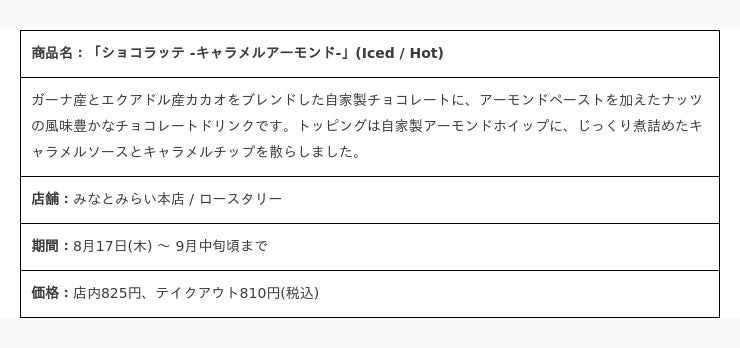 2017年に誕生以来、オータムシーズンに多くのファンを魅了してきた「ショコラッペ -モンブラン-」が今年もみなとみらい本店限定で登場、さらに各店舗にて新作のキャラメルとアーモンドの風味豊かなチョコレートドリンクを9月中旬頃までご用意いたします。