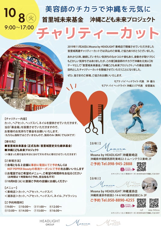 全国でヘアサロン、アイラッシュサロンなど160店舗以上を展開する株式会社ヘッドライト(本社:東京都港区、代表取締役 小松俊介)グループのオーナーサロン「Moana by HEADLIGHT(モアナ バイ ヘッドライト)」が、2024年10月8日(火)に【美容師のチカラで沖縄を元気に】をテーマとして「首里城未来基金」「沖縄こども未来プロジェクト」への募金活動を目的としたチャリティーカットを沖縄の2店舗で開催いたします。