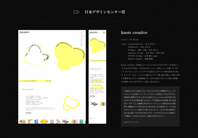 なかでもknots creativeはデザインの卓越性を認められたものに贈られる「日本デザインセンター賞」を受賞。日本を代表するグラフィックデザイナー、原研哉氏が率いる株式会社日本デザインセンターより賞状と審査コメントをいただきました。