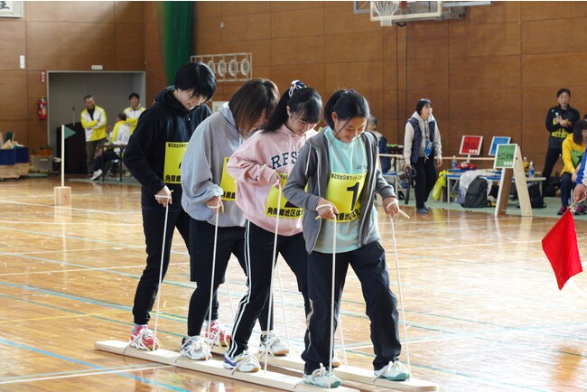 ウッドスポーツには「木ッター」「立ッター」「ゲッター」の 3 種目ありますが、今大会は長い下駄を履き直線コースを駆け抜ける「ゲッター」 に絞り選手権を開催、選手同士の協働が勝利へのカギを握る競技です。