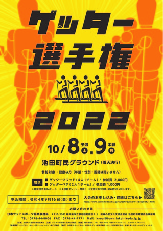 池田町および池田町教育委員会は、令和 4 年 10 月 8 日(土)9 日(日)の 2 日間、池田町民グラウンドにて池田町考案のウッドスポーツ「ゲッター選手権2022」を開催します。