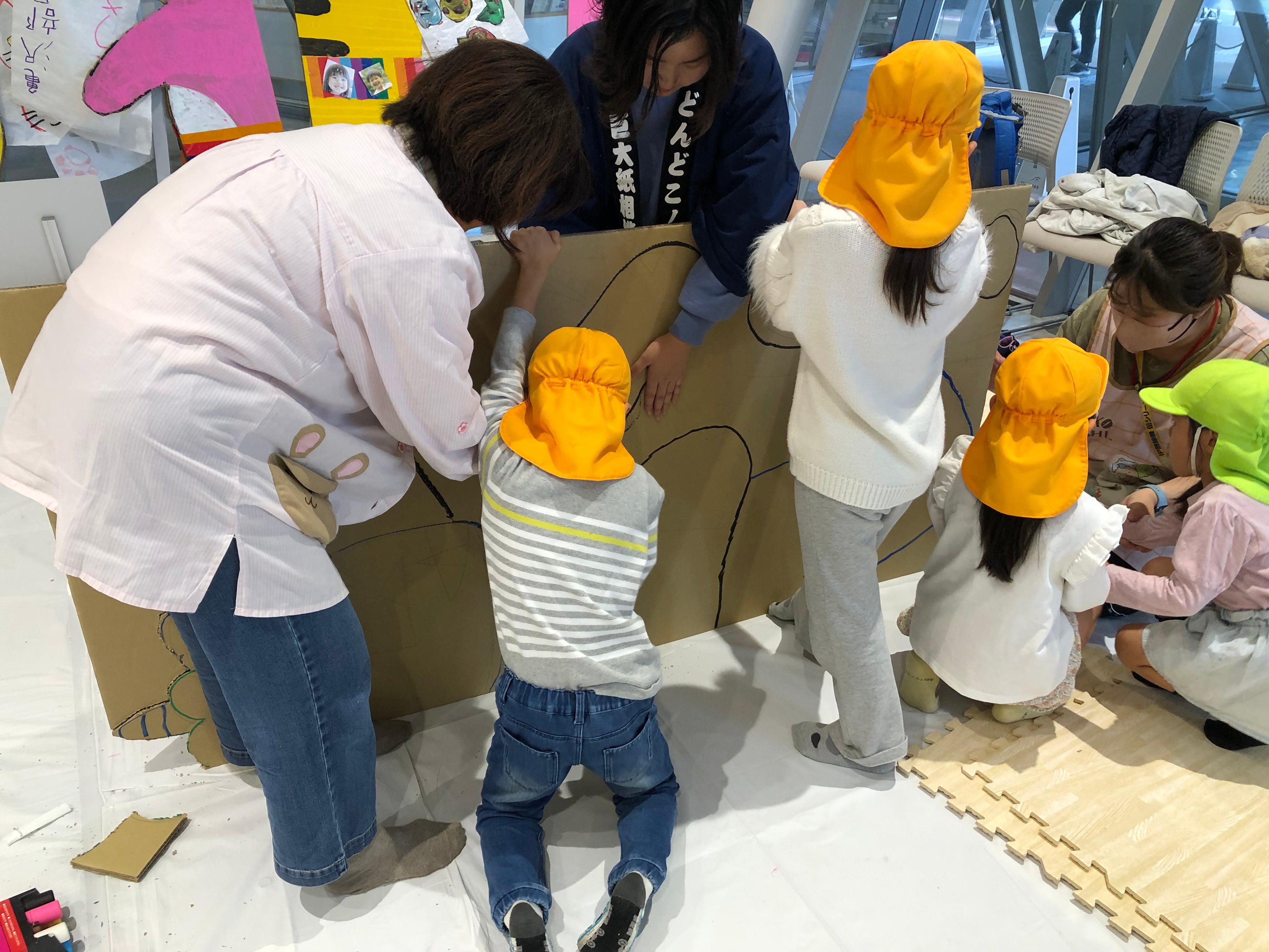 「巡業」と称する力士制作ワークショップでは、墨田区内に4つの部屋(東向島・亀沢・東駒形・キラキラ橘)を設けて、子どもたちを中心としたチームで、身長180cm超の巨大ダンボール力士をつくります。それぞれの部屋から8体ずつ、個性豊かな力士が集う「本場所」はトーナメント方式による取組で競い合い、優勝すると横綱の位に輝きます。会場では、制作チームはじめ応援に駆け付けたみんなで土俵を叩きながら対戦を進めるとともに、オリジナルのアプリ「電子どんどこ!」からも好きな力士を応援できます。取組の様子はYouTubeライブで配信し、スマホの画面をタップすると土俵の周りにあるハンマーが動く仕組みで、遠方からもたたき手として参加いただけます。