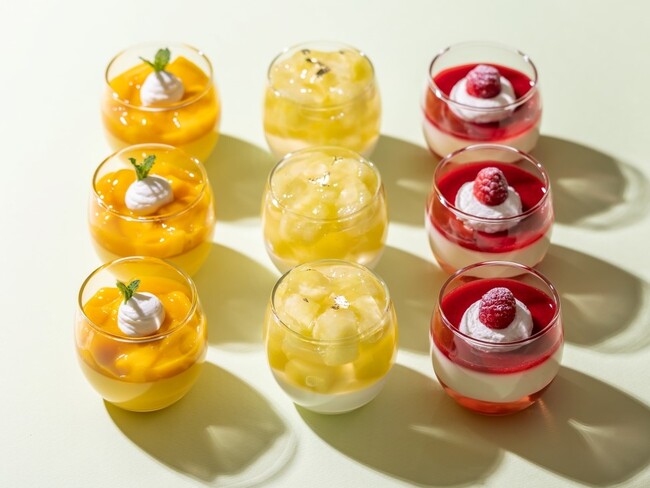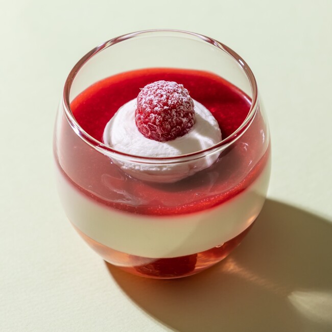 甘く香るピーチのプリンと透きとおるゼリーに、ラズベリーソースで酸味のアクセント。ピーチのみずみずしい味わいが楽しめる爽やかなグラスデザートです。