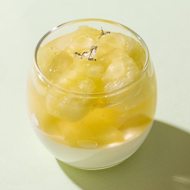 香り豊かなメロンをたっぷりと使ったグラススイーツ。ヨーグルトムースの上に、マスクメロンのゼリーと大きめにカットしたマスクメロンをトッピングしました。涼やかに透きとおる夏らしいスイーツです。
