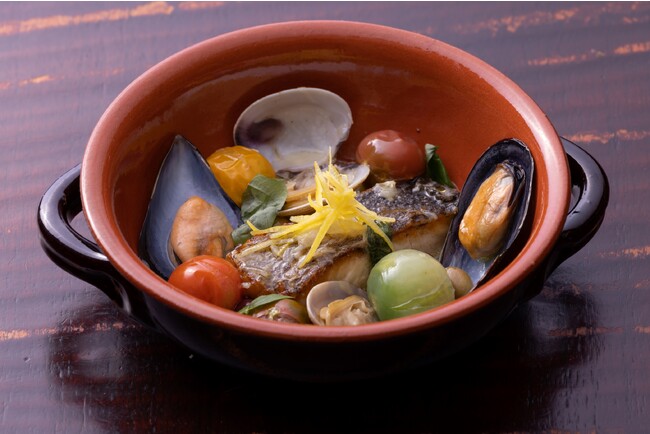 カンパーニャ州ナポリを代表する魚料理。アクアパッツァは「狂った水」という意味で、本来、魚と貝、海水で行う調理工程で、爆ぜる水の様子からこの名がつけられました。そこに高糖度で優しい酸味の瀬戸内レモンを合わせ、夏らしいカラフルなトマトがお料理を彩ります。