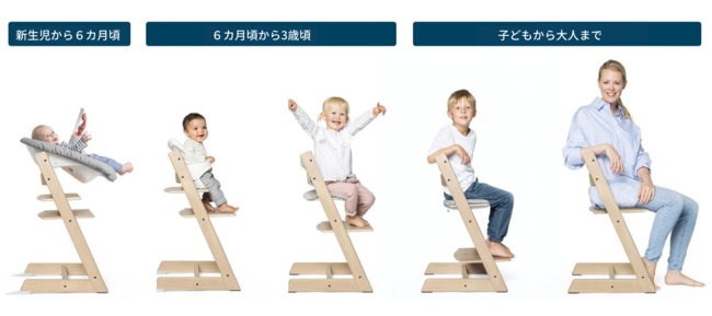 「子どもとともに成長する椅子-人生をともにする椅子」座面と足乗せ板の高さと奥行きを細かく調整することで、理想的な姿勢で座ることができます。アクセサリーを付けることで新生児から家族でテーブルを囲むことができ、大人までずっと使えます。1972年の誕生から今年で50年を迎えるロングセラー商品です。