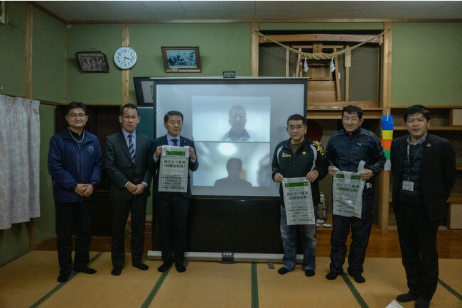 (写真左から大崎町役場住民環境課 松元昭二、ユニ・チャーム株式会社 和田充弘氏、ユニ・チャーム株式会社 織田大詩氏、タキロンシーアイ株式会社 加藤晋康氏《画面上》、タキロンシーアイ株式会社 牧村洋一郎氏《画面下》、平良衛生自治会 山野利高氏、平良自治公民館 近松輝久氏、大崎町役場住民環境課 竹原静史)