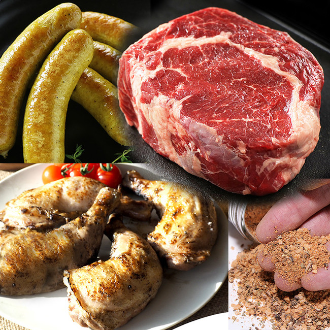 グラスフェッドビーフのリブロース、骨付きチキンレッグ、カレーソーセージとスパイスが付いた様々な肉が味えるセット。