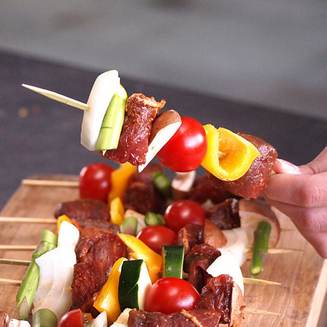 スパイシーに味付けされたグラスフェッドビーフとお好みの野菜を竹串に刺し、オリジナル串が作れるセットです。