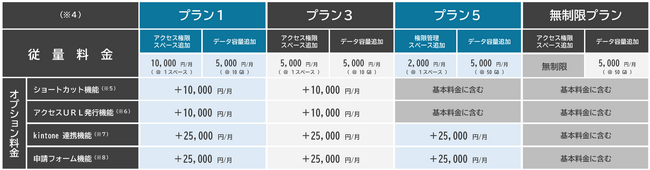※4 各プランともに、『アクセス権限スペース』、『データ容量』、『オプション機能』を追加することが可能です(下記参照)。