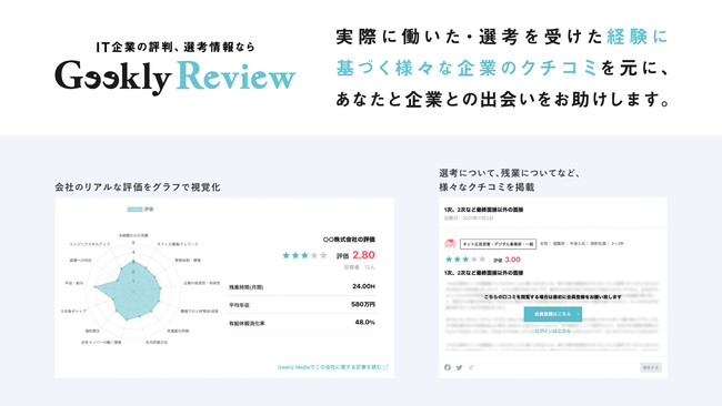既存の口コミサイトの多くが「企業情報の提供」にとどまっているなか、「Geekly Review」は「IT/Web/ゲーム業界の転職に特化した口コミサイト」として、ITエンジニアやクリエイターへより深い情報提供を行い、既存のエージェント事業とのシナジーを生み出しながら、ユーザーのキャリアに関する「悩みの解決」を目指してまいります。