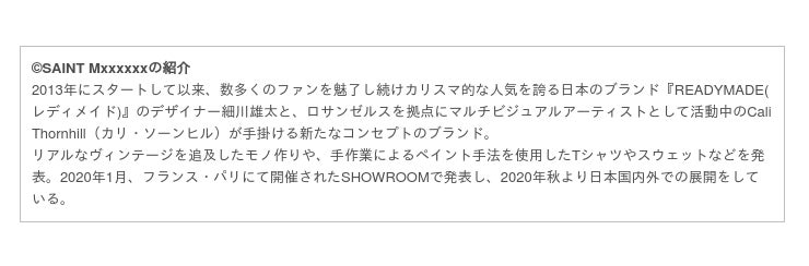 「(C)SAINT Mxxxxxx」は、ヴィンテージミリタリーファブリックをアップサイクルし新たに価値のあるものに生まれ変わらせる「READYMADE (レディメイド)」のデザイナーである細川雄太と、米国のビジュアルアーティストCali Thornhill(カリ・ソーンヒル)が共同で設立したブランド。アーティスティックなグラフィックと、リアルなヴィンテージ感を追求しており、 世界的なセレブリティらが着用していることでも話題を集めています。