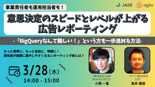 株式会社JADEが3月28日(木)に開催する無料ウェビナー「事業責任者も運用担当者も意思決定のスピードとレベルが上がる広告レポーティング~BigQueryなんて難しいという方も一歩進める方法~」に、アジト株式会社(東京都千代田区、代表取締役:高井 康辰、以下アジト)の高井がゲストとして登壇いたします。