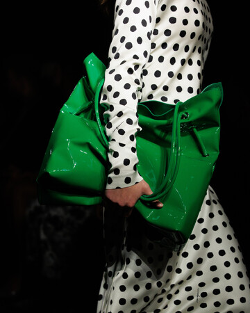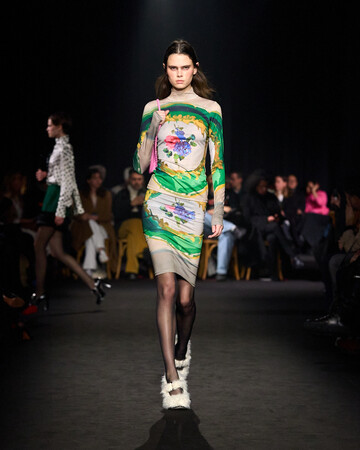 カクテルのアクセントはパンクのディテールと融合し、ボリュームと質感が強調されている -きらめく刺繍と光沢のあるマテリアル、 体にフィットしたアイテムとオーバーサイズの服が混ざり合い、親に借りてきたようなワードローブを新しいルックにアレンジ。 そして、皿、グラス、クリスタルのシャンデリア -上流階級の居間の表象- ベルギー人アーティスト、Jan De Vliegherの作品は 鮮やかなブラッシュストロークで衣服に描かれた。