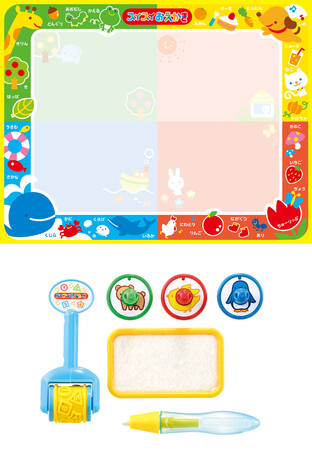 また、シートに描いたものは乾くと自然に消えるので、何度でもくり返し遊べます。専用ペン、スタンプ、ローラーだけでなく、手や足を水で濡らして手がたや足がたも楽しめます。