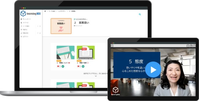 learningBOX ONとは、eラーニング作成・管理システムであるlearningBOXに、企業で必須となる研修コンテンツを簡単に追加することができるサービスです。